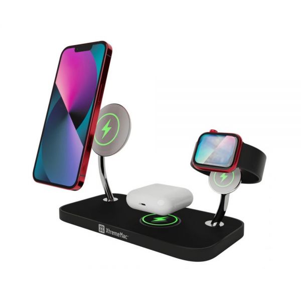Base de carga inalámbrica 3 en 1 para iPhones 12, 13, 14 y 15, AirPods y Apple Watch, que utiliza la tecnología inalámbrica certificada por Apple más actualizada. Solución completa, elegante y perfecta para cualquier fanático de Apple: cargue de la manera más rápida de forma inalámbrica su iPhone (15 W), Apple Watch (2,5 W) y AirPods (5 W).