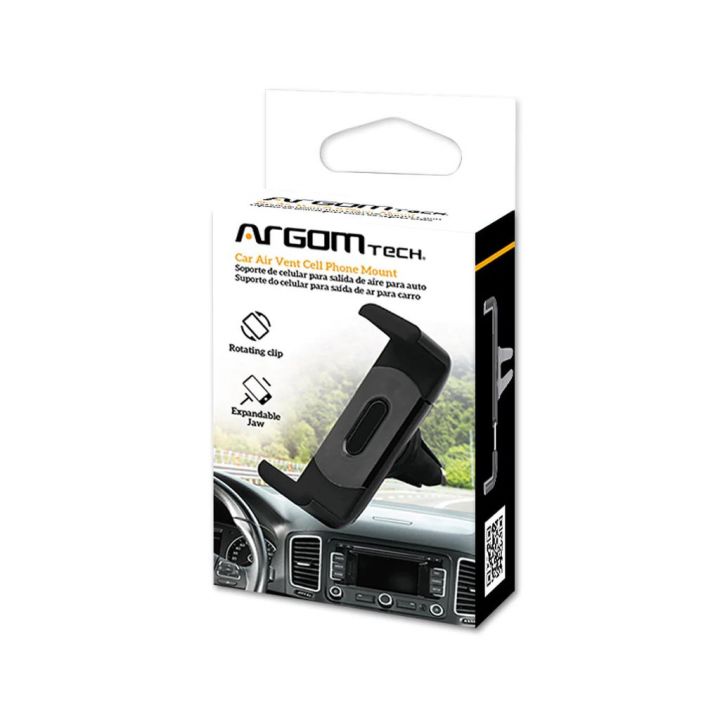 El soporte de carro ArgomTech, funciona muy bien para llevar sin problemas tu celular en movimiento, con Clip giratorio para montar en ducto de ventilación de aire giratoria con mordaza; y ajuste expansible que sujeta de forma segura la mayoría de los teléfonos celulares.