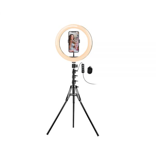 El Spotlight Aro ARGOM‑LP‑9320BK es un aro de luz LED de 10″ ideal para fotos, videos y transmisiones en vivo, con 3 modos de color, 10 niveles de brillo, trípode ajustable, soporte para smartphone y control Bluetooth.