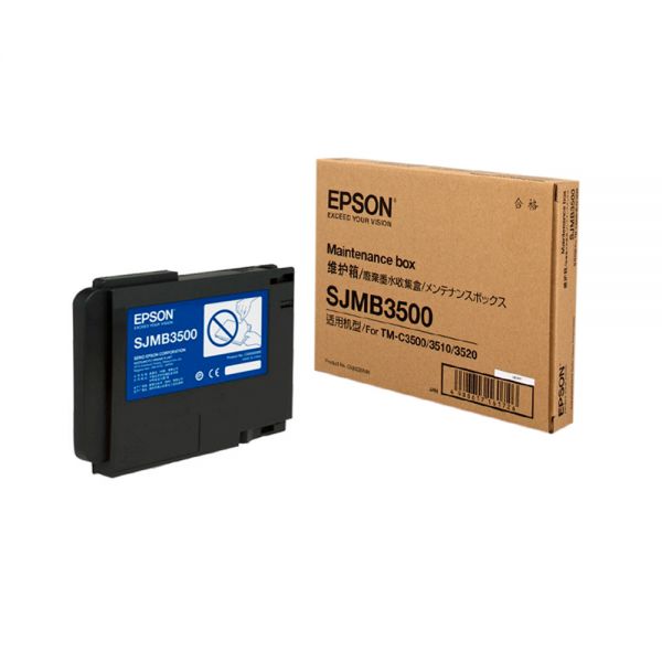 Tanque de mantenimiento SJMB3500, un componente esencial para las impresoras Epson ColorWorks TM-C3500, TM-C3510 y TM-C3520. Este tanque recoge el exceso de tinta durante los ciclos de limpieza del cabezal, ayudando a mantener el rendimiento óptimo de la impresora.