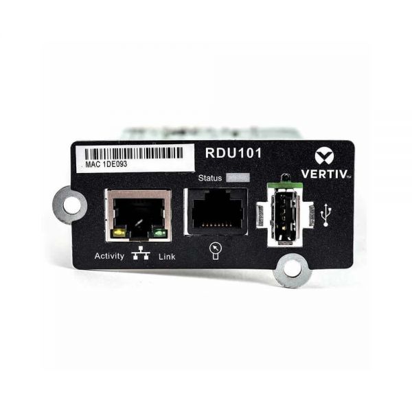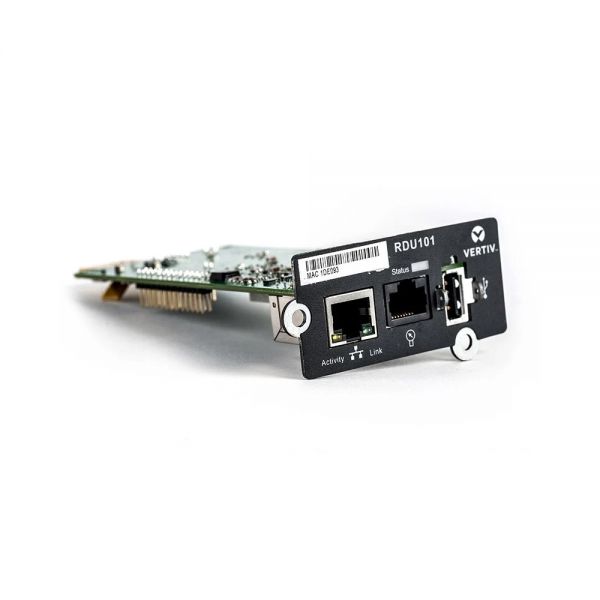 La tarjeta de comunicaciones Vertiv™ Liebert® IntelliSlot™ RDU101 permite la comunicación entre productos Vertiv™ como Trellis™ Enterprise, Trellis™ Power Insight y LIFE™ Services. Proporciona acceso web y datos a través de SNMP y Modbus TCP para equipos Vertiv. Los datos de los sensores ambientales se proporcionan a través de la web y SNMP.